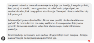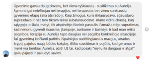 Stoti į akistatą su savim, savo baimėm, pykčiu, pavydu, liūdesiu, nėra lengva. Pradžioje nesąmoningai priešinausi, veliau paleidau…Buvo ašarų, nuostabos ir tuo pačiu palengvejimo. Bet tas kelias, nueitas kartu su Aurelija terapijoje, buvo vienas geriausių mano sprendimų ir investicijų į save.